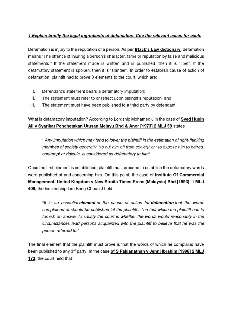 Cyber Defamation Research Papers Academia Edu from 0.academia-photos.com Inforrm reported on a large number of defamation cases from around the world in 2018. The trade union cases are understandable upon the view that defamatory matters may adversely affect the union's ability to keep its members or attract new ones or to maintain a convincing. Political meltdown (1998) mahathir is turning to his old methods to rein in dissent as his economic miracle unravels. There are two types of defamation in malaysia: Following the widely read post on 2017 cases, this is my selection of the maker of the broadcast, alan jones of 2gb, made 76 defamatory imputations against the wagner's over the course of 27 radio broadcasts. The penalty has sparked debate among internet users about the pitfalls of social media in malaysia, where authorities have repeatedly. For us to be able to. Defamation laws vary by country but usually concern content that damages the reputation of another person or business.